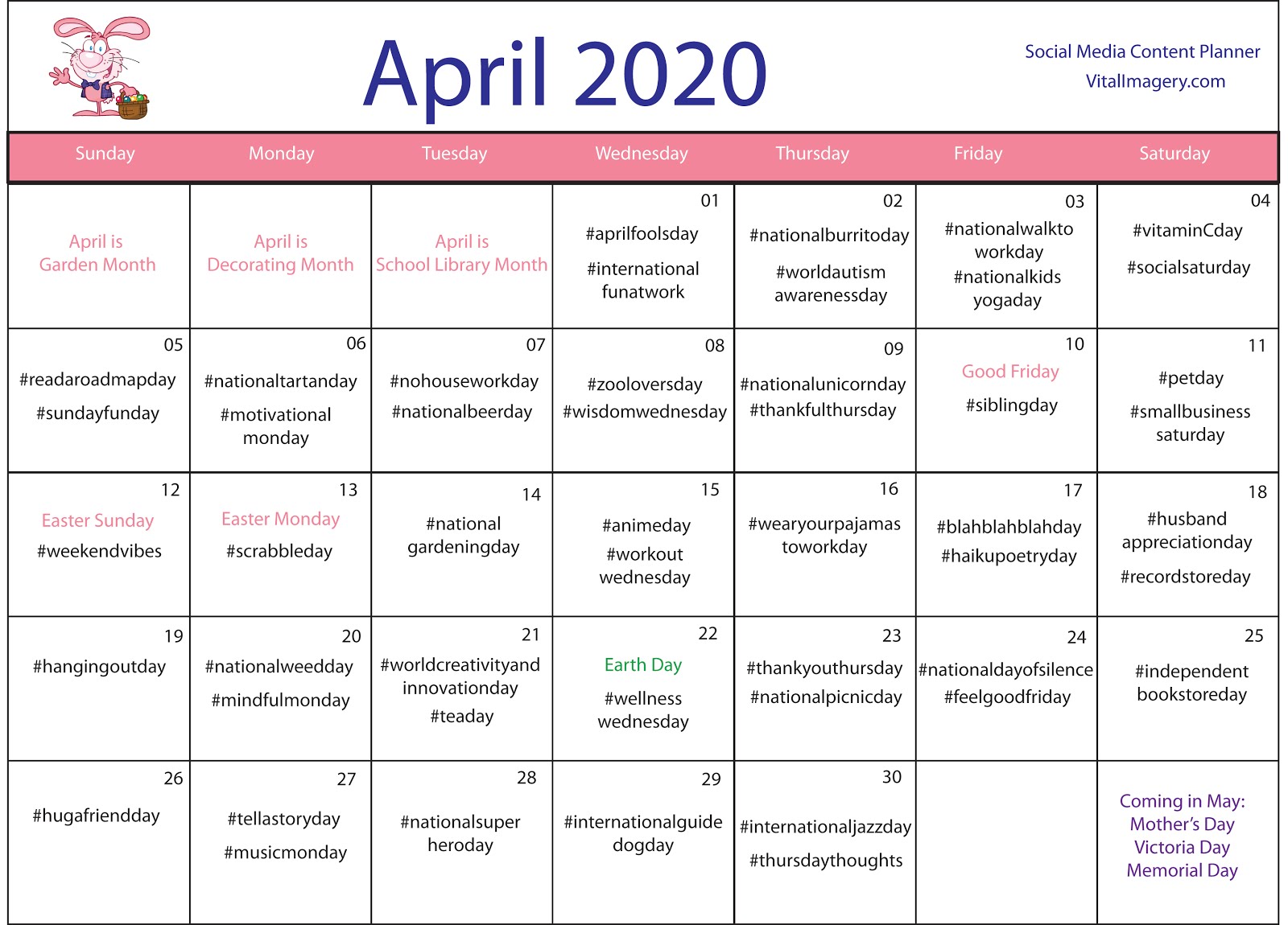 Vital Imagery is dedicated to making your content marketing the best it can be. Each month we will be preparing a social media content calendar to help with your social media posts and marketing. You will have access to a calendar filled with special dates, holidays, #hashtags and links to images that would be great to use on all your social media platforms. During these unprecedented times, as many of you are working from home and practising physical distancing, we hope these monthly calendars will help with your social media content.